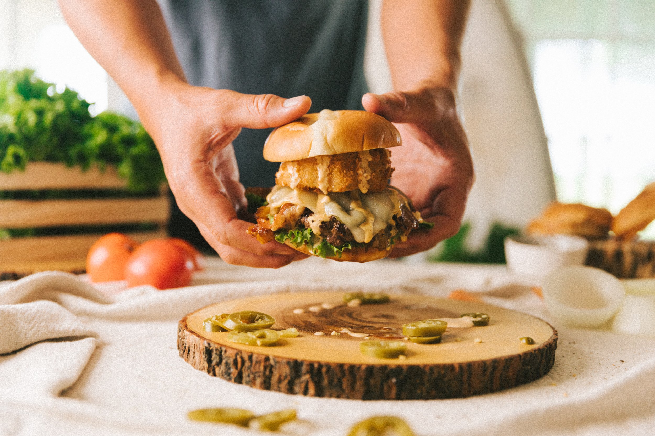 We use nothing but the best, fresh quality ingredients, never-ever frozen meat ( no antibiotics, no hormones) freshly baked buns, clean organic vegetables, and hand-sliced potatoes. We demand quality in every bite, right down to the hand-torn lettuce.